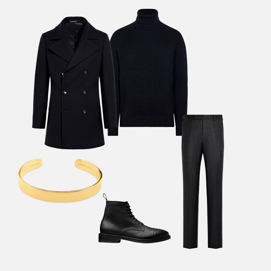 The Look: A navy peacoat, a navy turtleneck sweater, and dark grey trousers – a classic ensemble. Black boots finish the look.