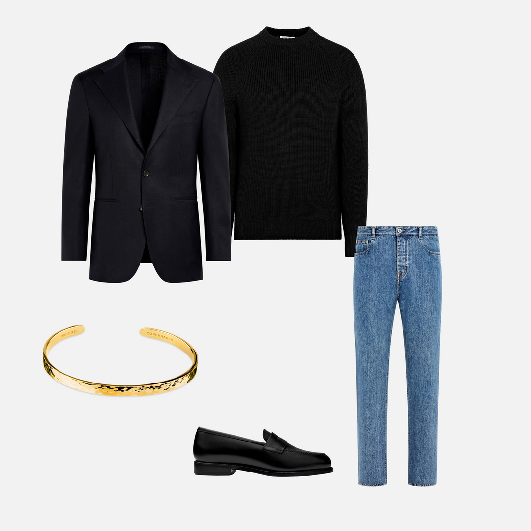 The Look: A navy blazer, black merino sweater, and medium blue jeans create a modern professional vibe. Black loafers complete the look.