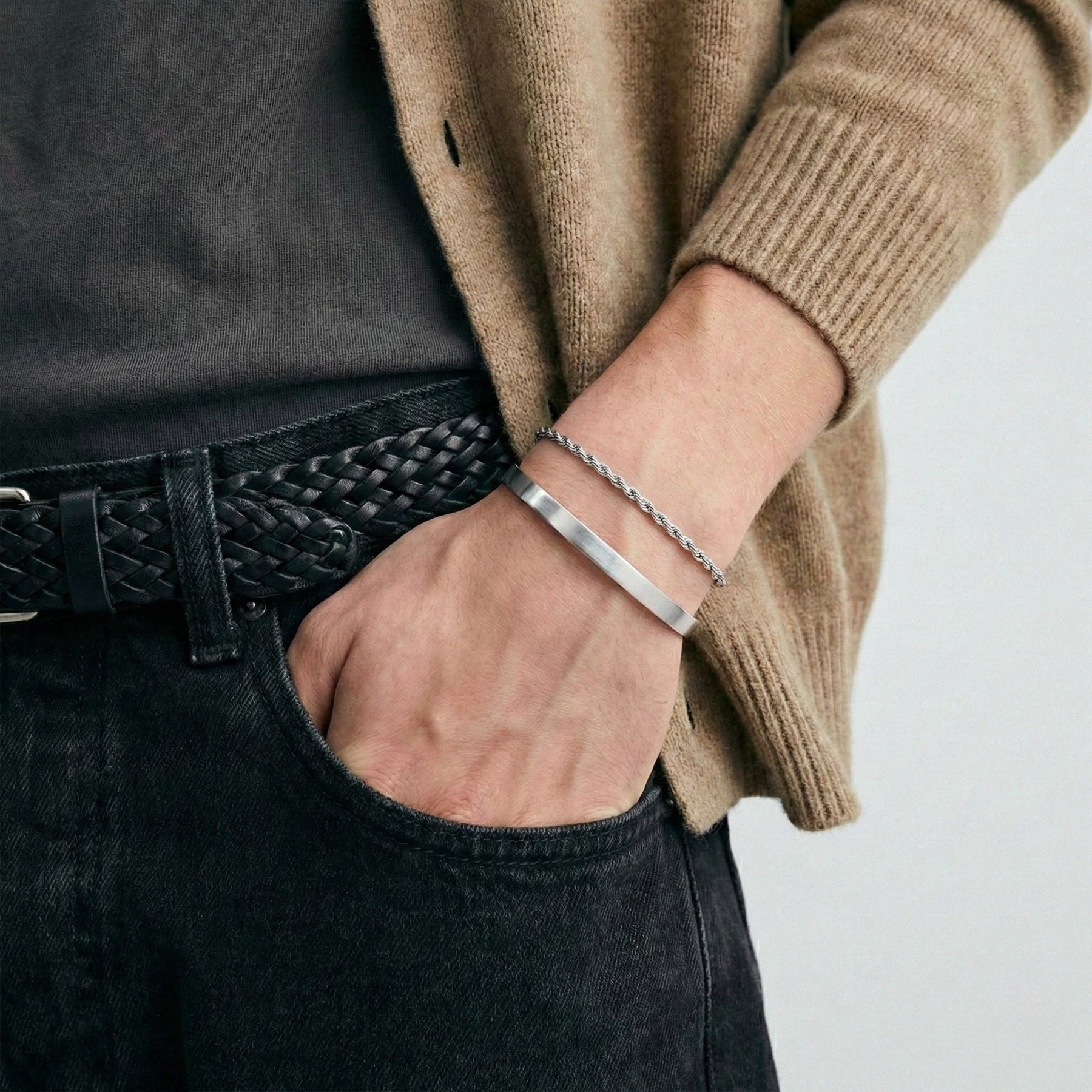 To markante smykker i ét sæt: Det stilrene Bruce Armbånd Slim kombineret med det strukturerede Rope Armbånd – til den moderne mand med sans for detaljer.